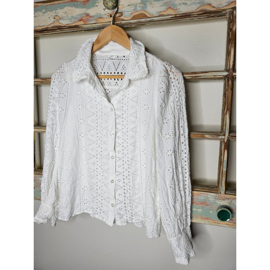 A Loves A Eyelet Lined White Button Up Top Ladies size Medium