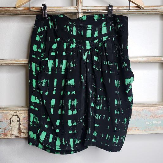 MYNE 100% silk mini skirt black/ green brush stroke design in ladies size 6
