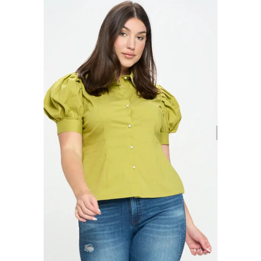 NWOT Green Button Up Puff Short Sleeve Top Cottage Style Size 3x/ 16