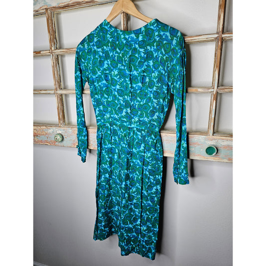 Vintage Floral Dress in Blues & Greens Long Sleeved Knee Length Dress size Small