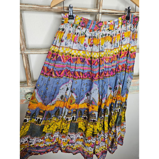 Vintage Cotton Lined Colorful Elastic Wasit Midi Skirt Coastal Town Scene Size Small