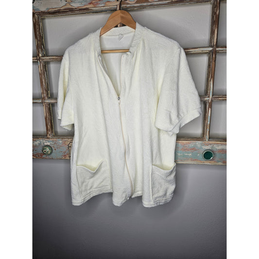 Vintage Cream Terry Cloth Zip Up Top W/ Pockets Oversized Unisen Size Small
