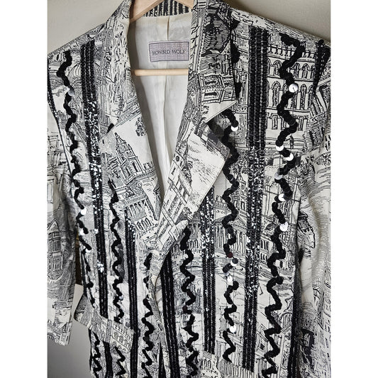 Vintage European Black/White Scenic Blazer with Sequin ric/rac front Size Large
