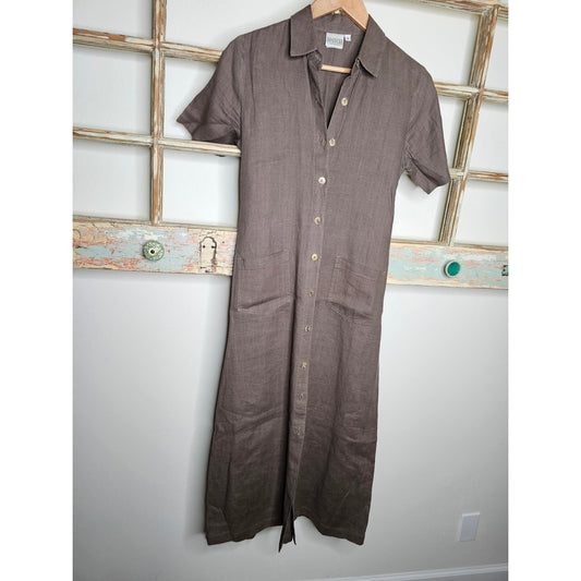 Vintage Match Linen Taupe Short Sleeve Button Up Midi Dress Size 4