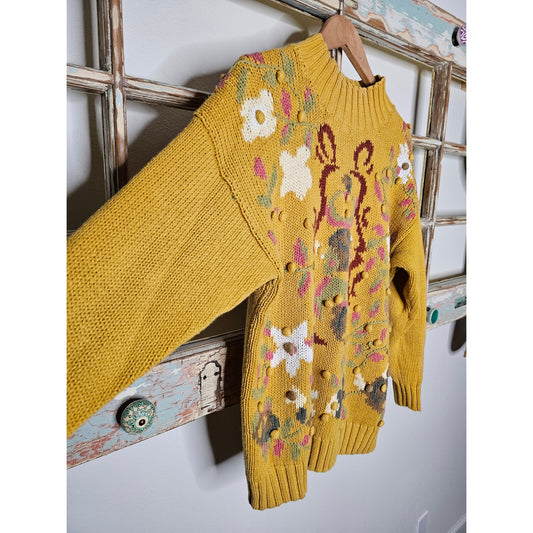 Vintage Mock Neck Yellow Knited Sweater with floral design size Large