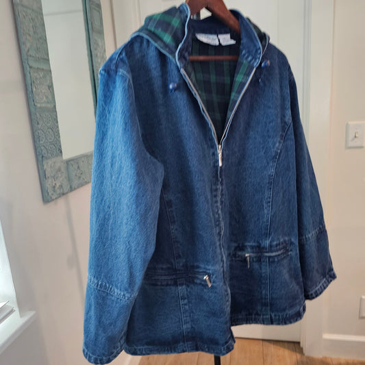 Vintage North Style Denim Jacket W/ Hood Plaid Interior Size Medium