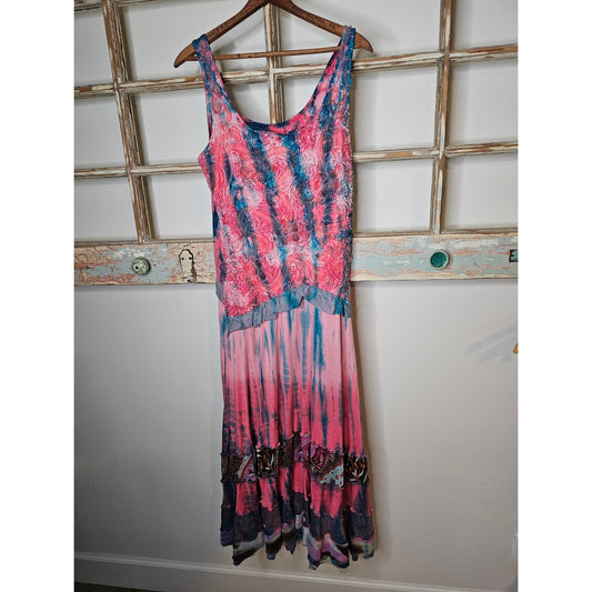 Boho Tie Dye Sleeveless Midi Dress With Layers of Detail Ladies size Medium