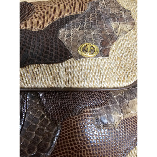 Carlo Fiori Vintage Envelope Straw & Snakeskin Clutch W/ Snap Closure