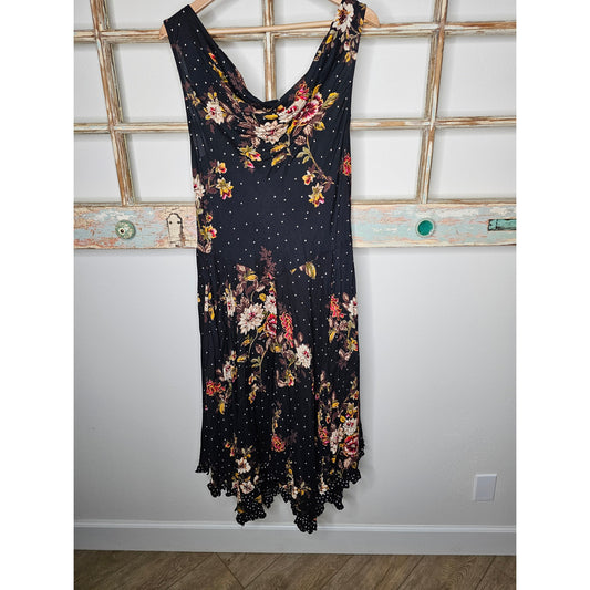 Vintage Sky & Sand Rayon Floral Black Midi Dress Handkerchief Hem Size XL