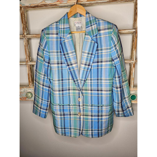 Vintage Talbots Plaid Lined Linen Blend Blazer Ladies Size Medium Petite