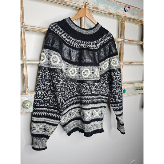 Vintage Sweater Black/cream/Gray Oversized Sweater with leather Size Medium