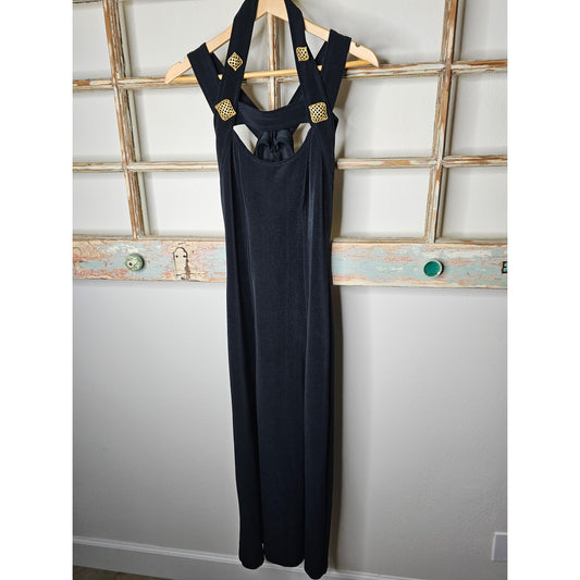 Vintage Strappy 80's Black Midi Slip Dress With Gold Accents Size 6