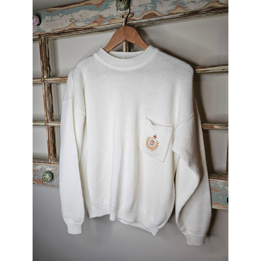 Vintage White Embroidered Crested Sweater size Medium