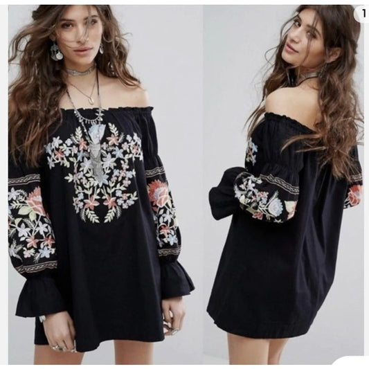 Free People Boho Off The Shoulder Black Embroidered Dress ladies size small
