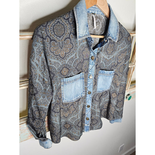 Free People 100% Denim Long Sleeve Button Up Boho Cowgirl Top Size XS