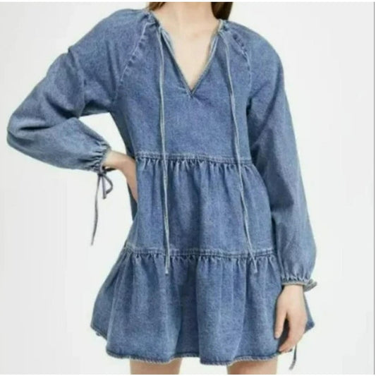 En Saison Bruna Medium Wash Denim Mini Tiered Babydoll Dress Size XS