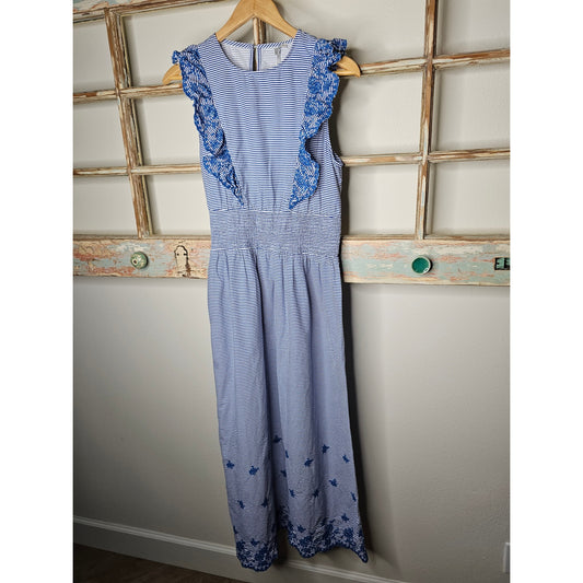 Koton Blue & White Stripe Midi Dress with Ruffles and Embroidery Ladies size Medium
