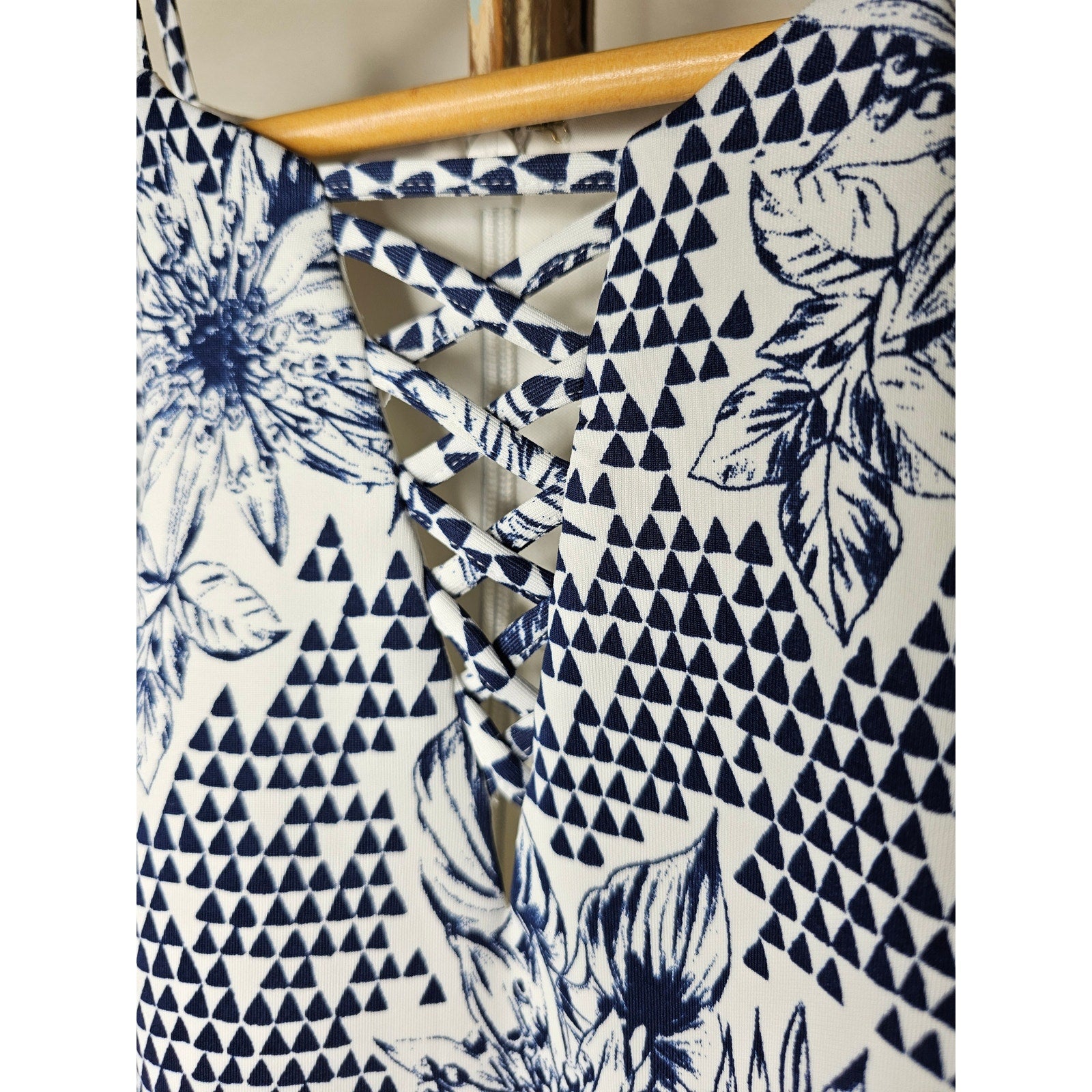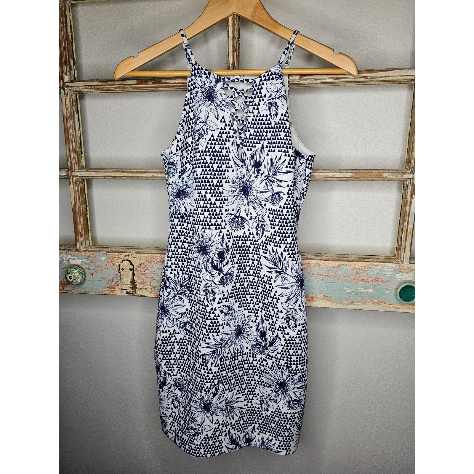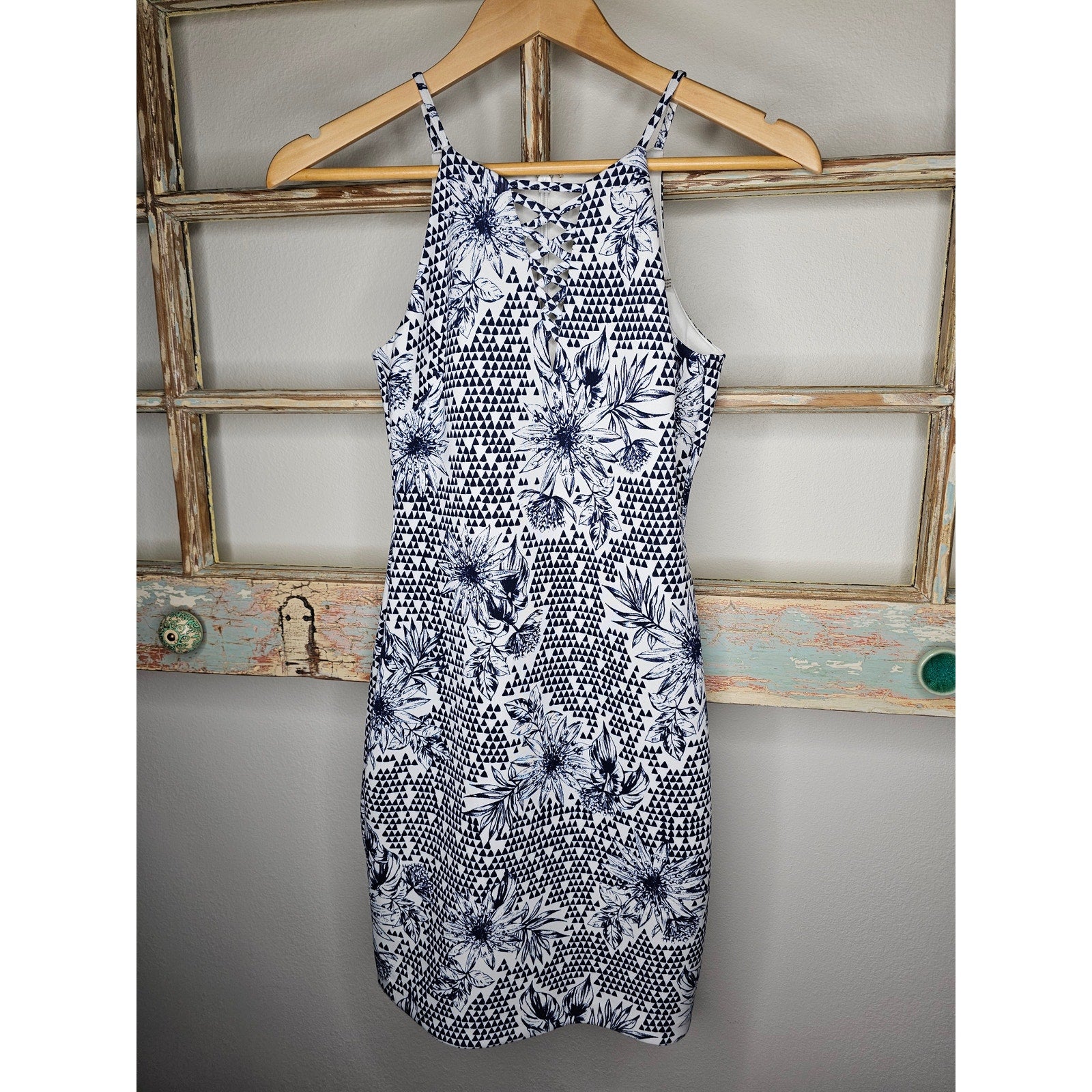 Guess Los Angeles Tropical navy/white sleeveless mini dress ladies size 0. This dress is lined and has a back zipper. It is comprised of polyester and spandex and in pristine condition. It features crisscross front chest design and spaghetti straps. This piece measures 14.5" pit to pit and 35" in length.