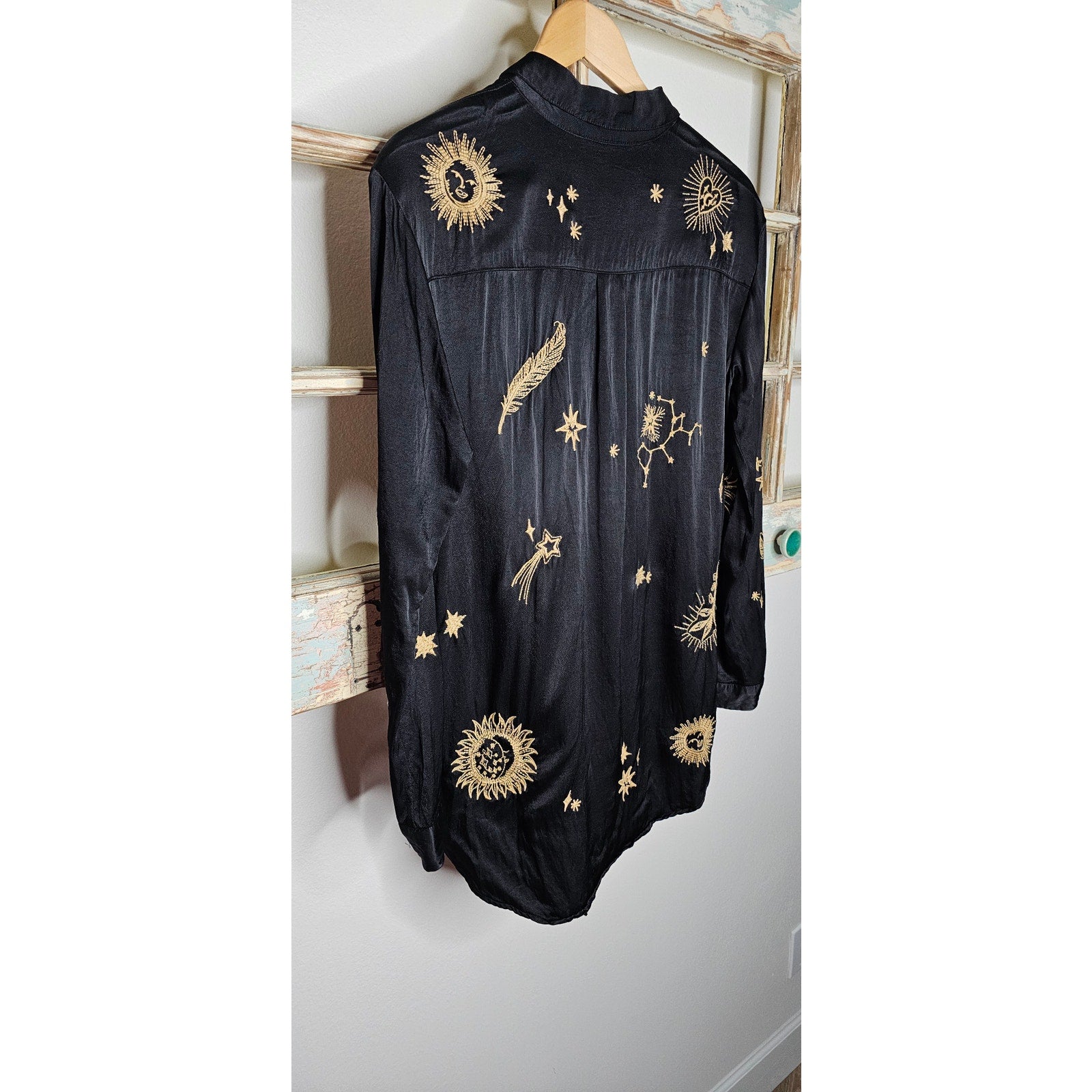 Johnny Was Workshop black button up high low blouse with gold Celestial embroidery in ladies XS. This shirt is wearable art truly a stunner. Wear closed or opened with a tank underneath. For the astrology lover for sure! Buttons at cuffs and measuring 21" pit to pit with a front length of 28" and back length of 30" No imperfections to speak of.