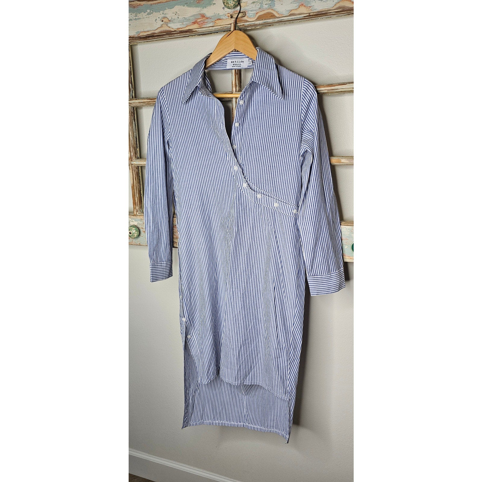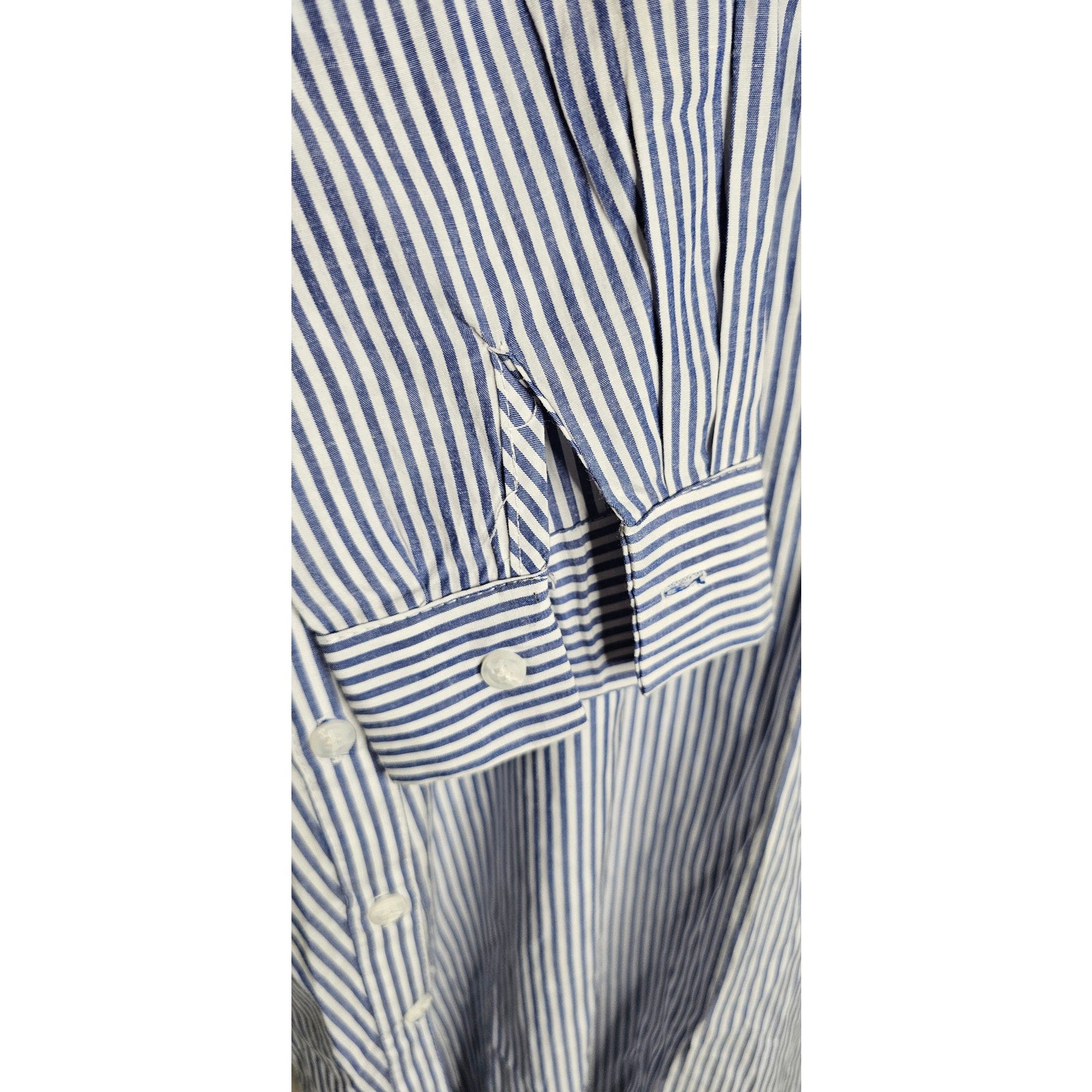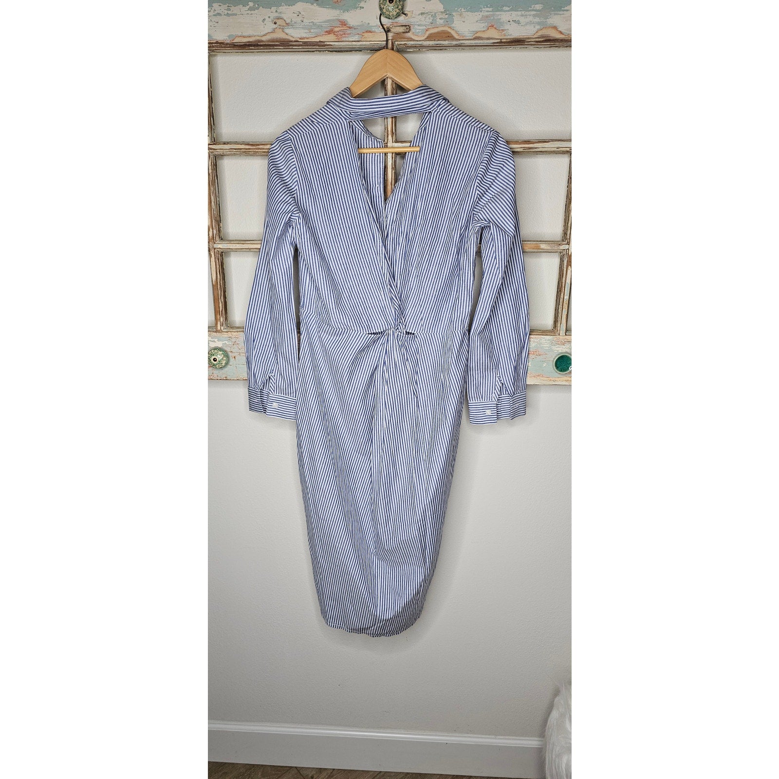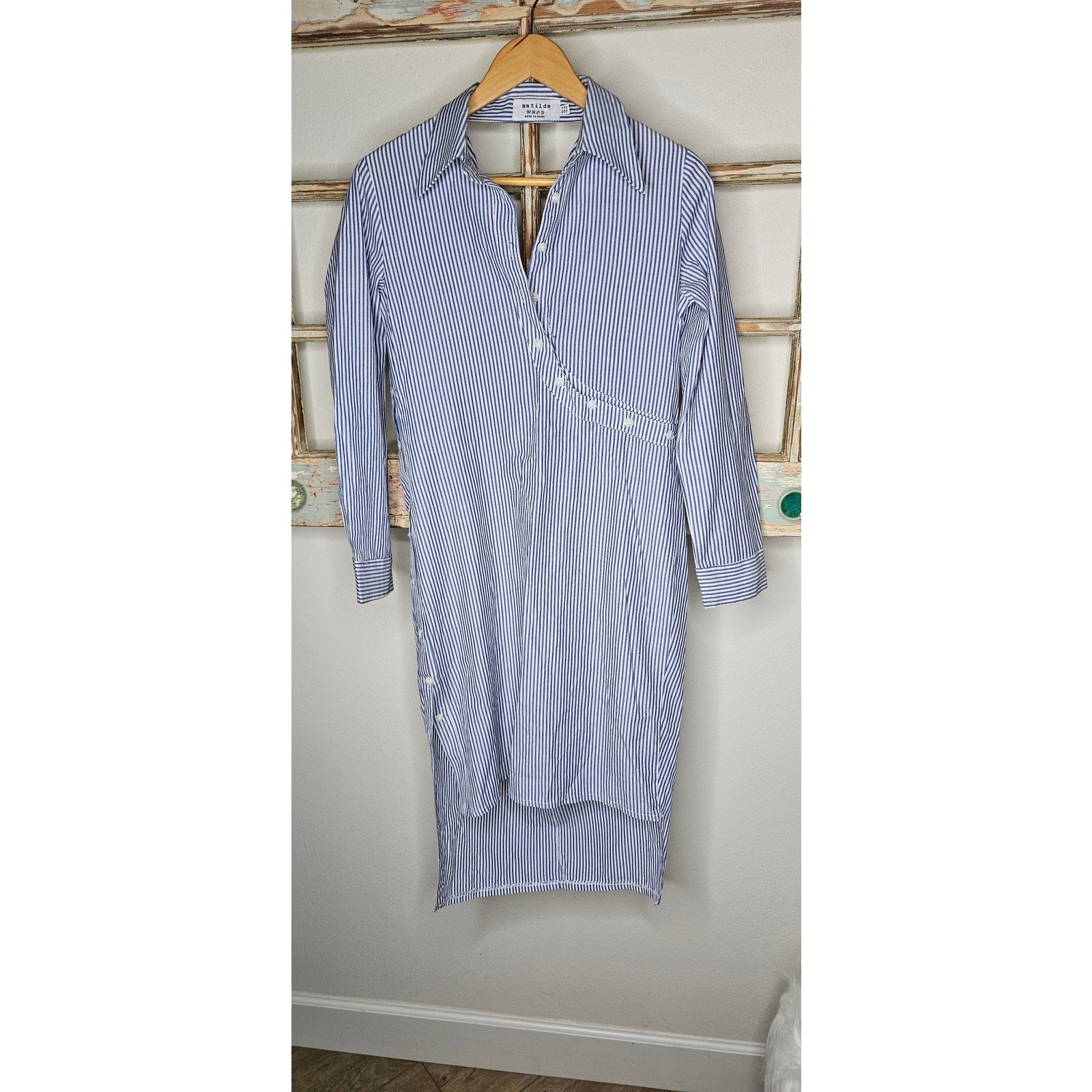 Matilda blue and white stripped Oxford style high low dress size 4. This Dress has buttons up front and side. The back has an open V mid back and long cuffed sleeves. This dress measures 20.5" Pit to pit, 37.5 length in front and 44.5" length in back.