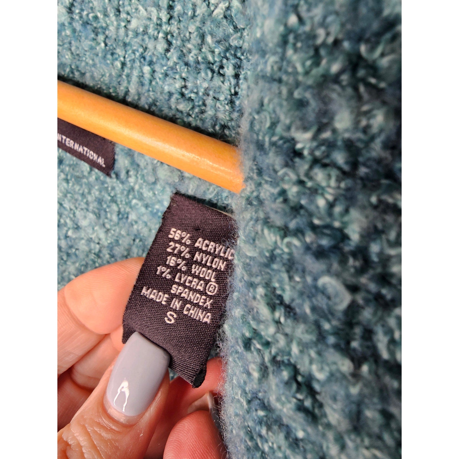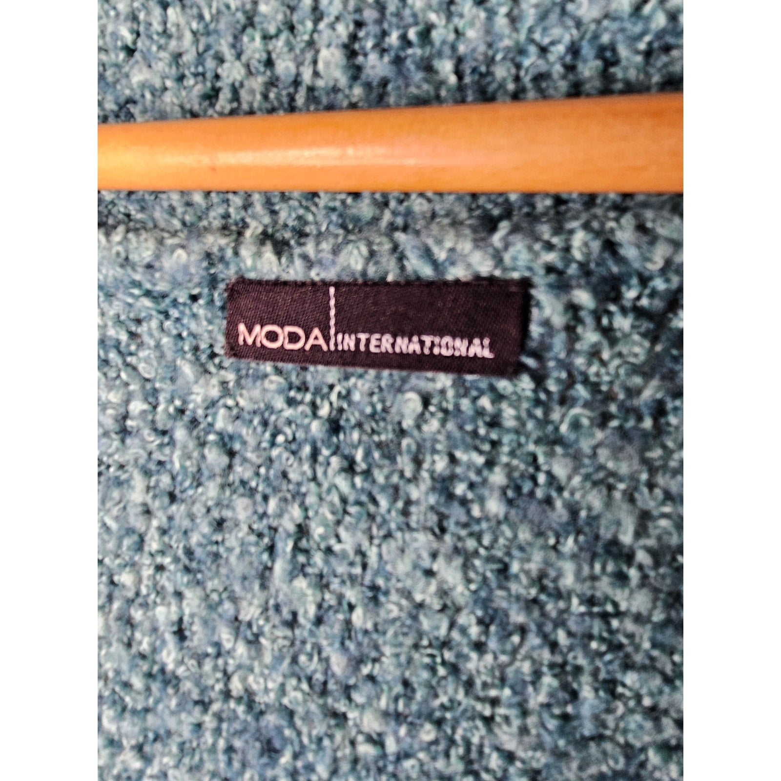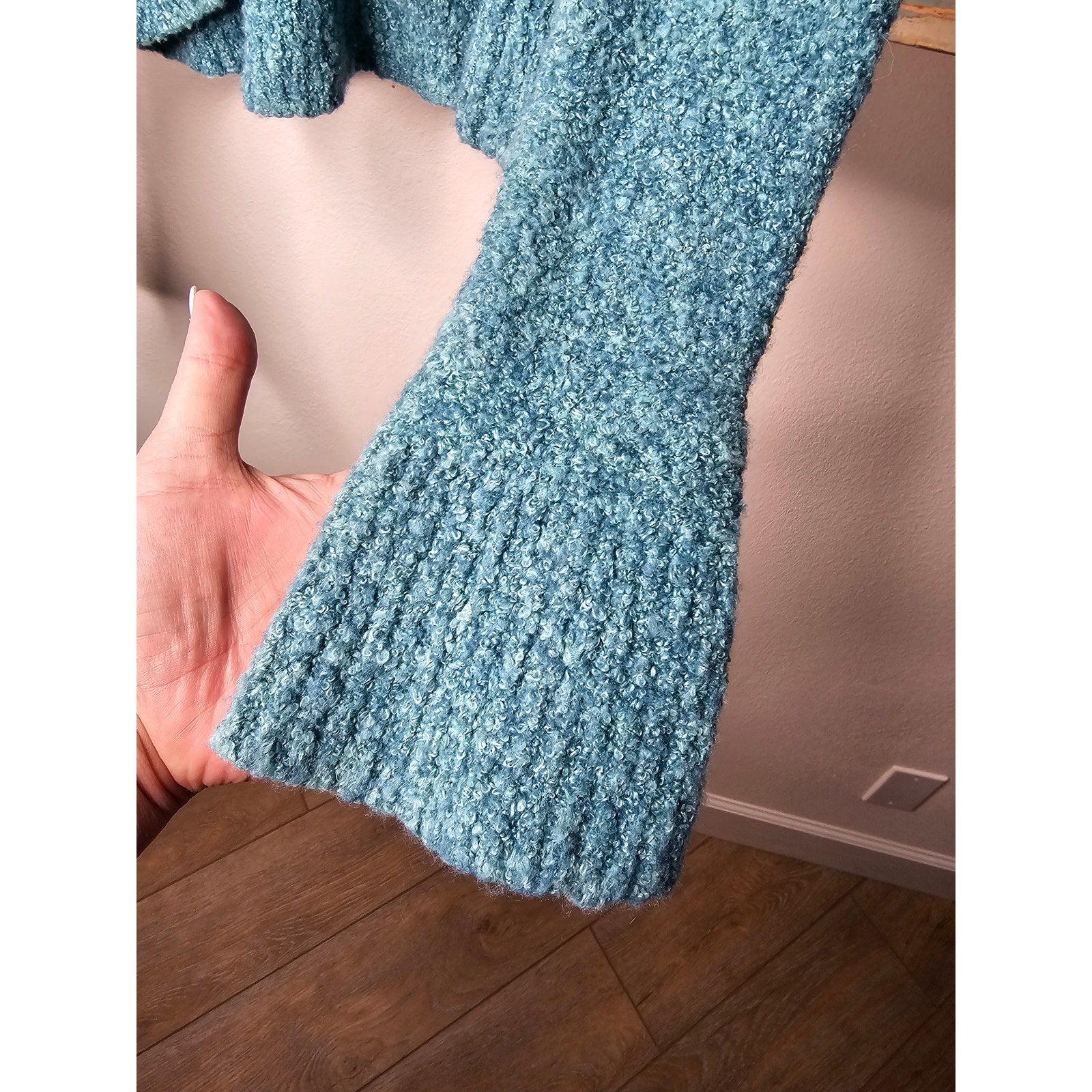 Moda International Cardigan with ruffled front and bell cuffs size small. Comprised of Acrylic, nylon and wool. This cardigan is super soft and comfy with no imperfections. It measures 17.5" pit to pit and 24" in length with lots of stretch.