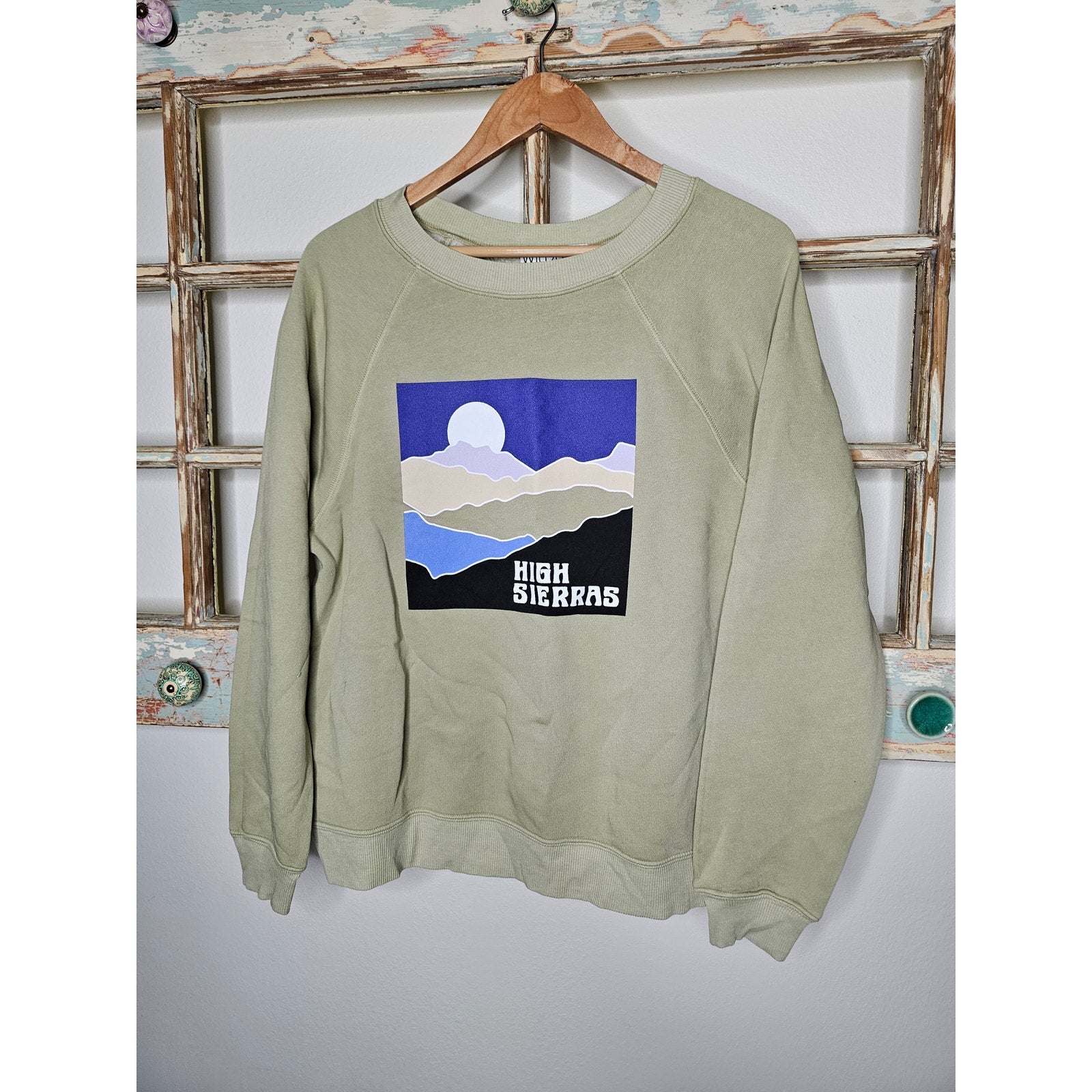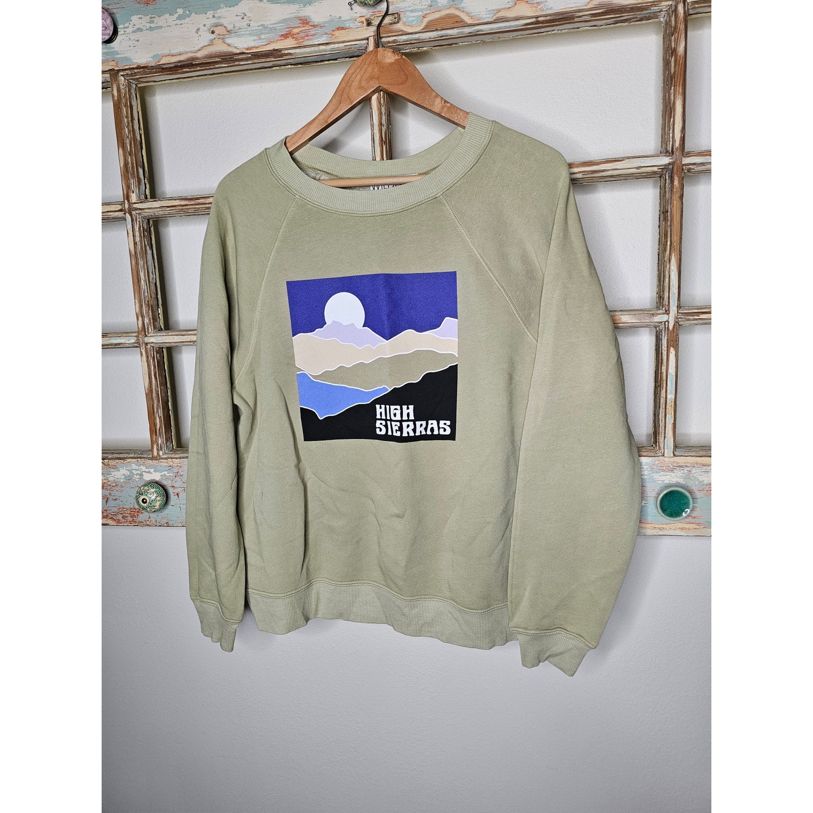 New Wildfox Basil High Sierras Mountain Sommers Sweatshirt Size small. This sweatshirt is super soft and known to be a comfortable wear. From Beach Bonfires, boat rides to cool temperature office buildings stay cozy with this sweatshirt. It is made of cotton and poly blend and has a crew neckline and lastly the beautifully bold mountain graphic on the front. This sweatshirt is oversized and measures 23" pit to pit and 24.5" in length.